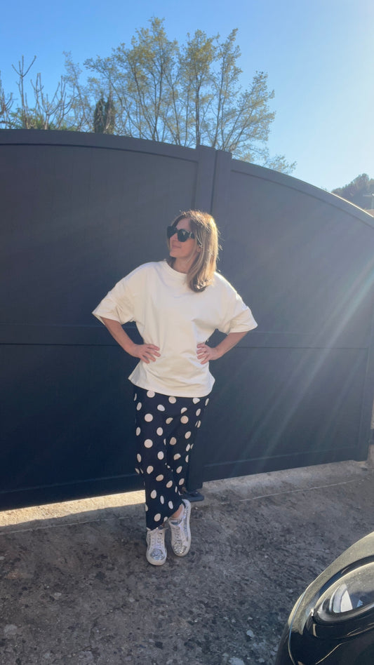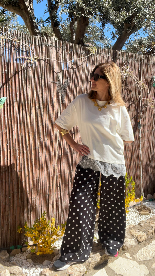 PANTALON STYLE JOGG NOIR A POIS BLANC