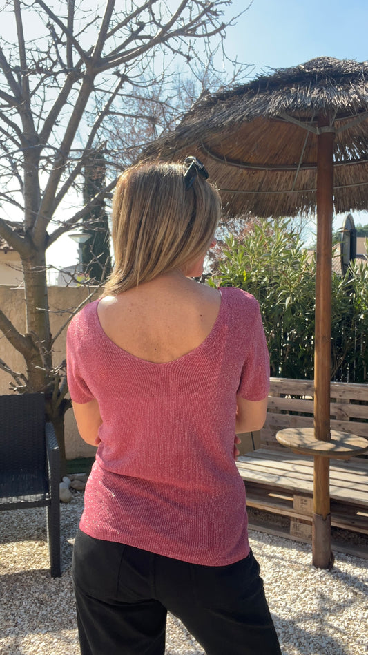 TOP MANCHES COURTES VIEUX ROSE PAILLETE
