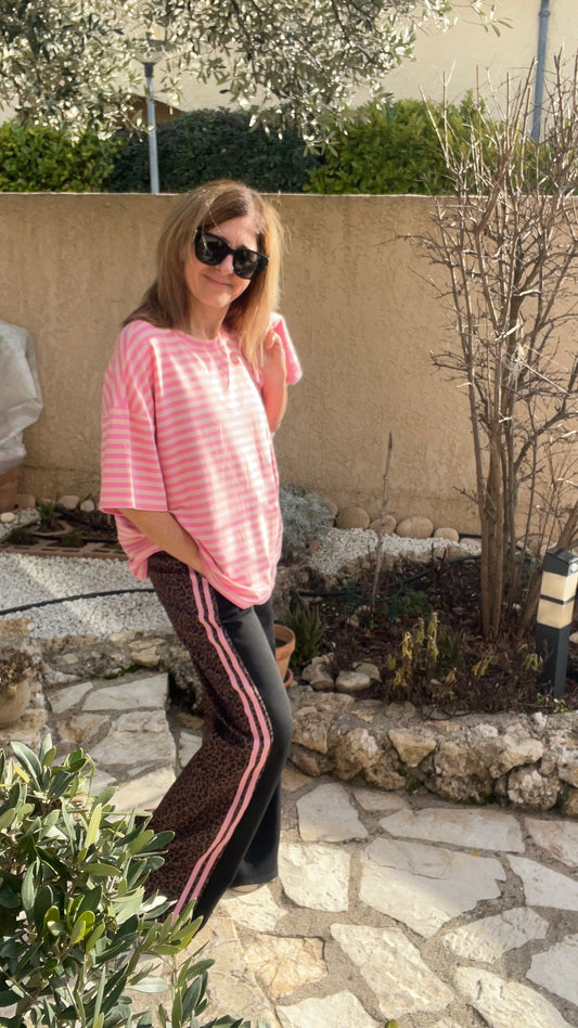 PANTALON STYLE JOGGING NOIR BANDE ROSE/LEOPARD
