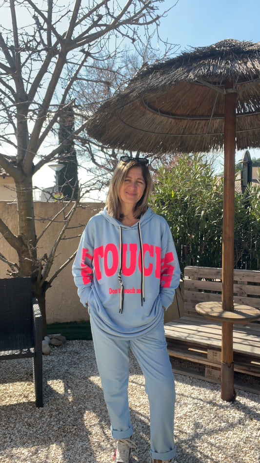 SWEAT BLEU & ROSE FLUO A CAPUCHE "DON'T TOUCH ME"