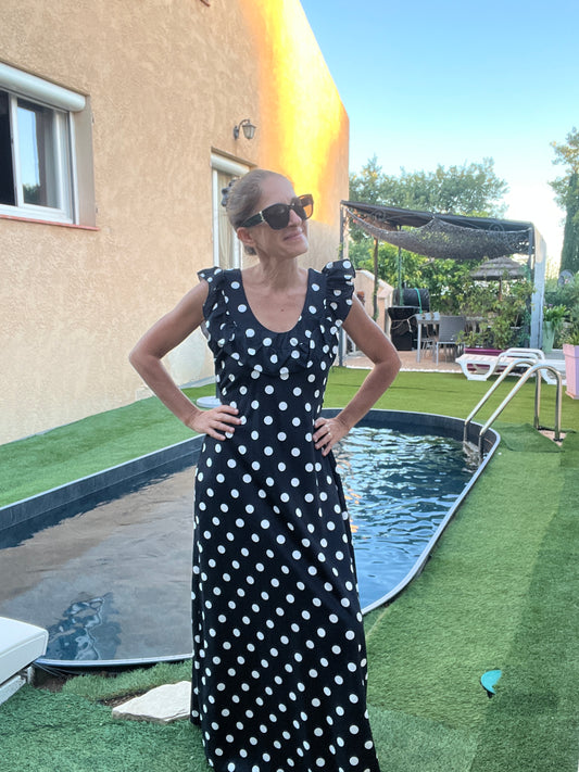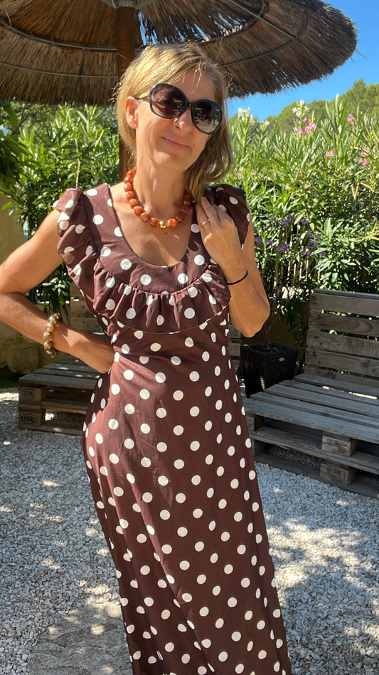 ROBE LONGUE CHOCOLAT A POIS BLANC