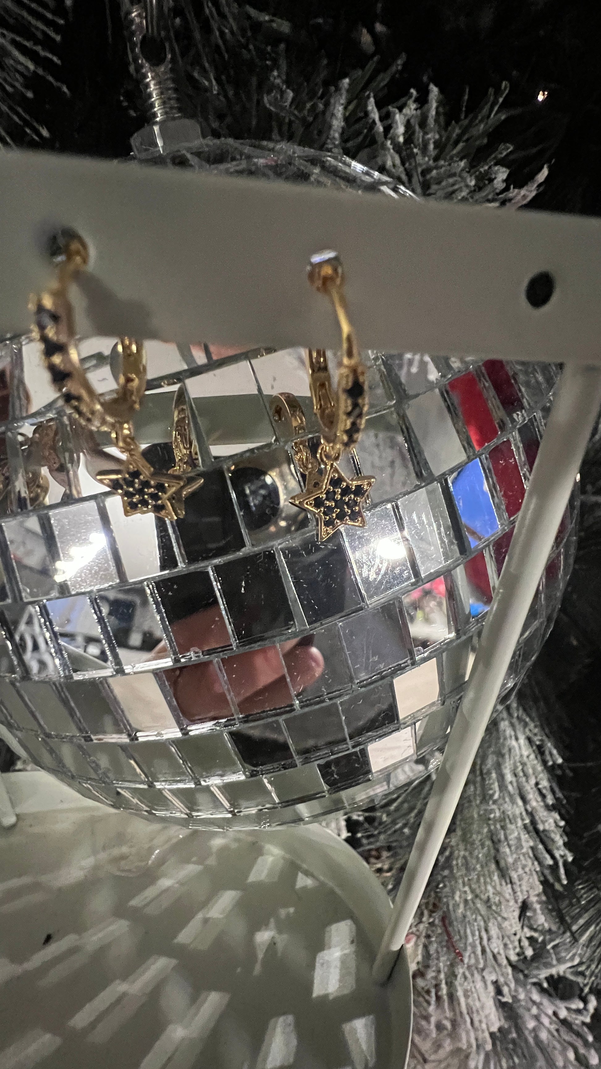 Ces anneaux dorés et noirs avec mini charm's étoile séduisent par leur design raffiné et contemporain. L’association du doré lumineux et du noir profond crée un contraste élégant, tandis que le petit pendentif en forme d’étoile apporte une note céleste et délicate.