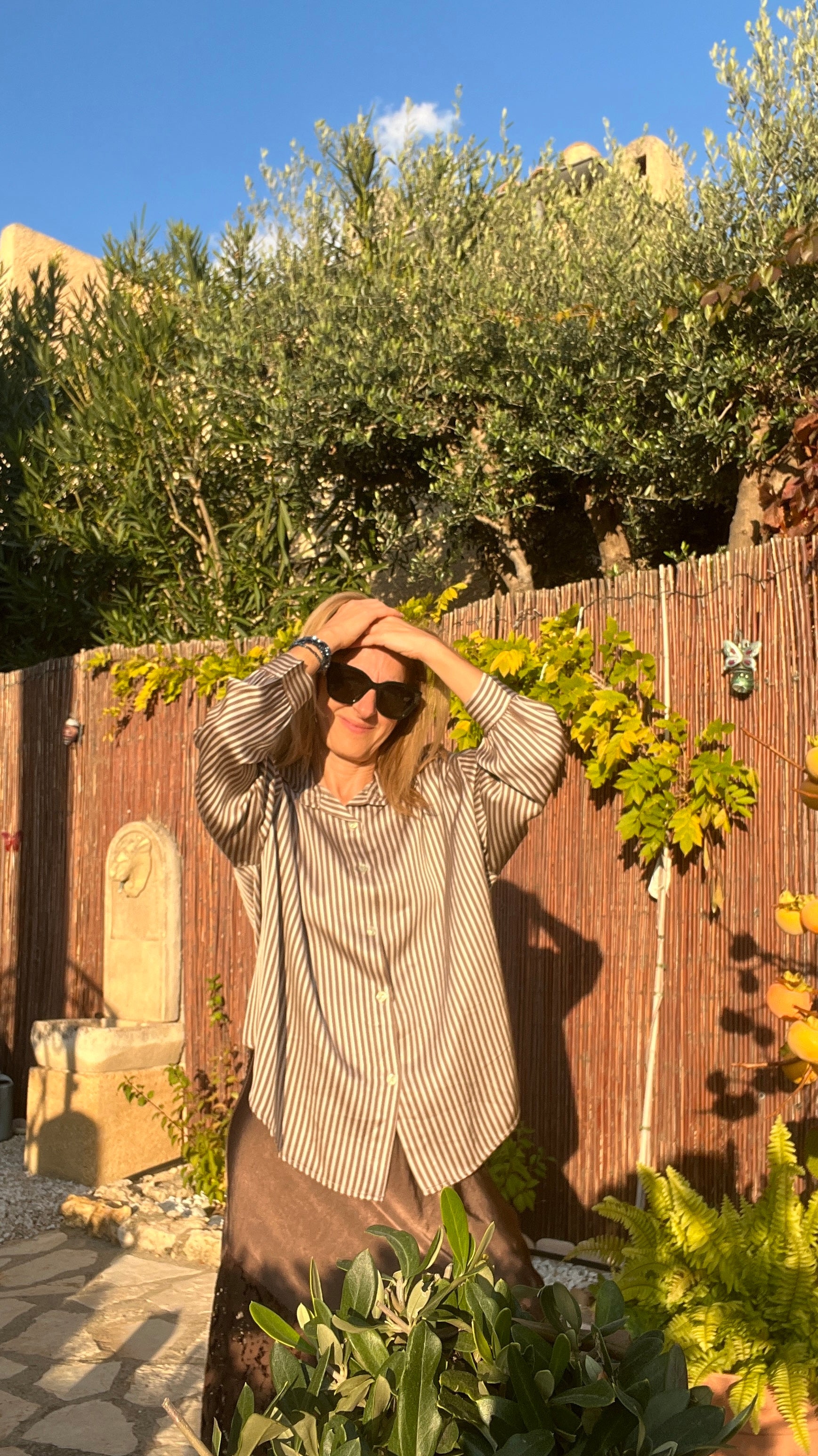 Élégant et raffiné, ce chemisier rayé chocolat et beige incarne parfaitement le chic naturel et la douceur des créations Clothes by M&C.