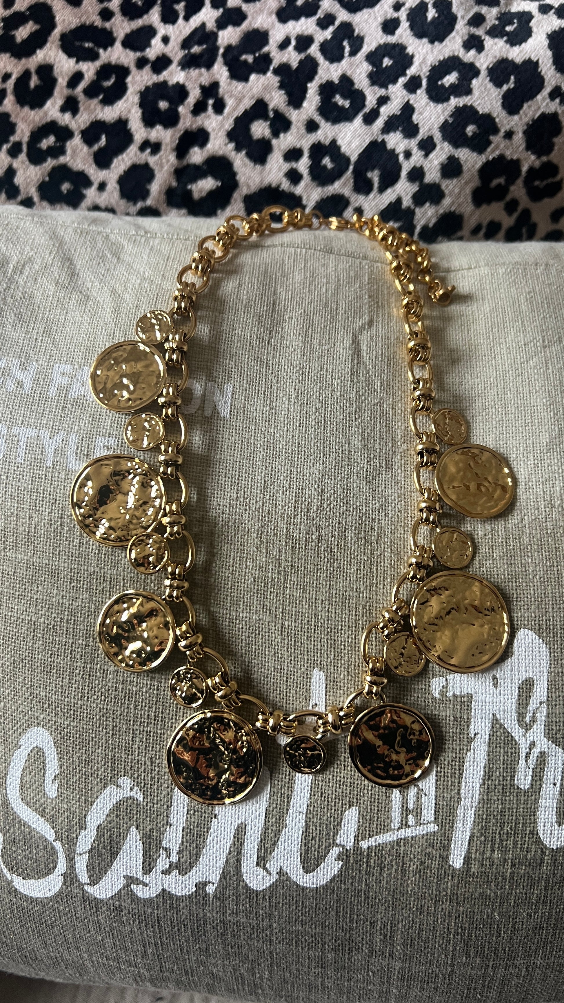 Le collier est également ponctué de grands médaillons en forme de pièce ou ronds, apportant du caractère et un style unique. Léger mais affirmé, il se porte facilement au quotidien ou pour des occasions spéciales, et se marie parfaitement avec d’autres bijoux pour un look superposé tendance.