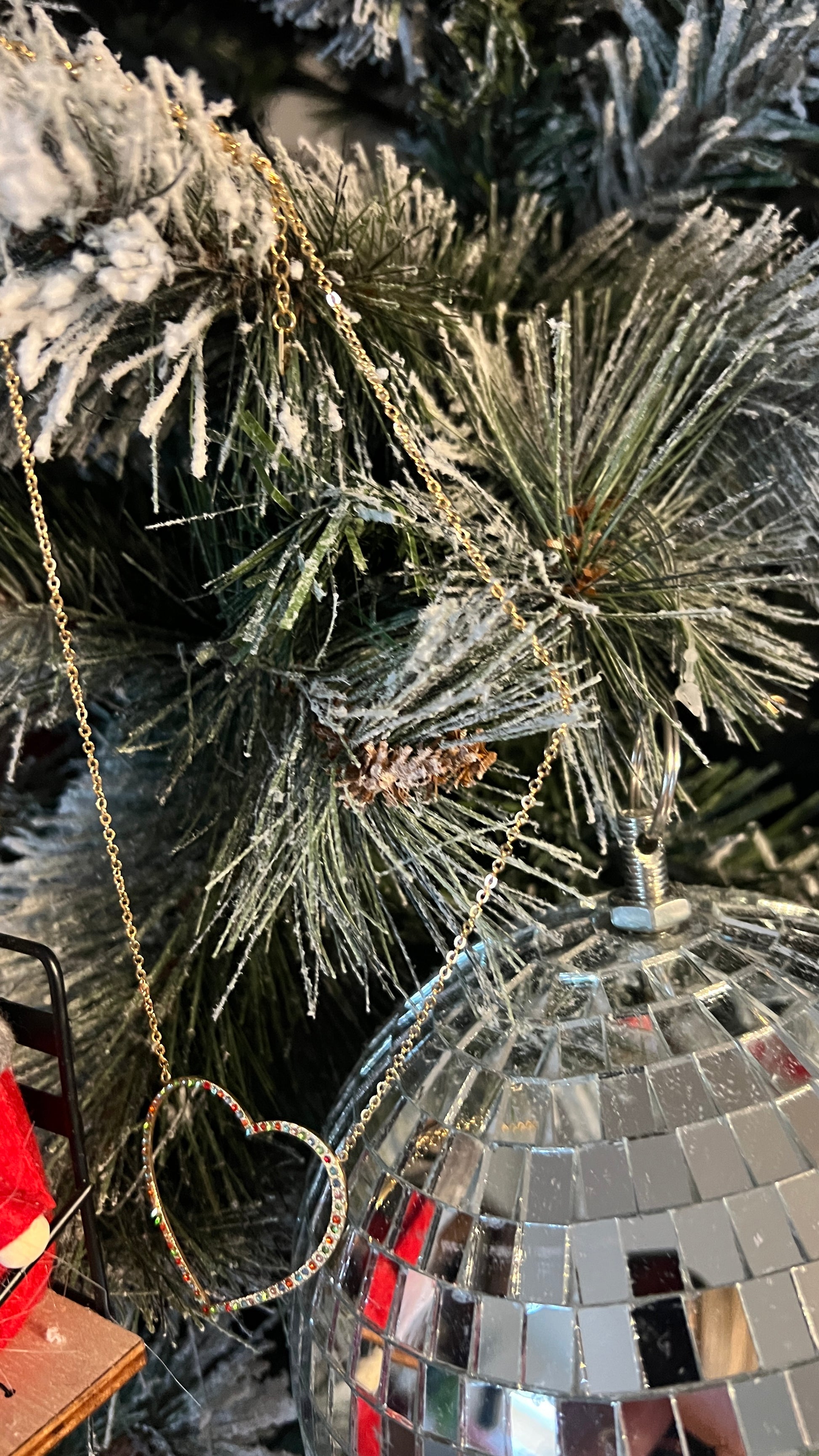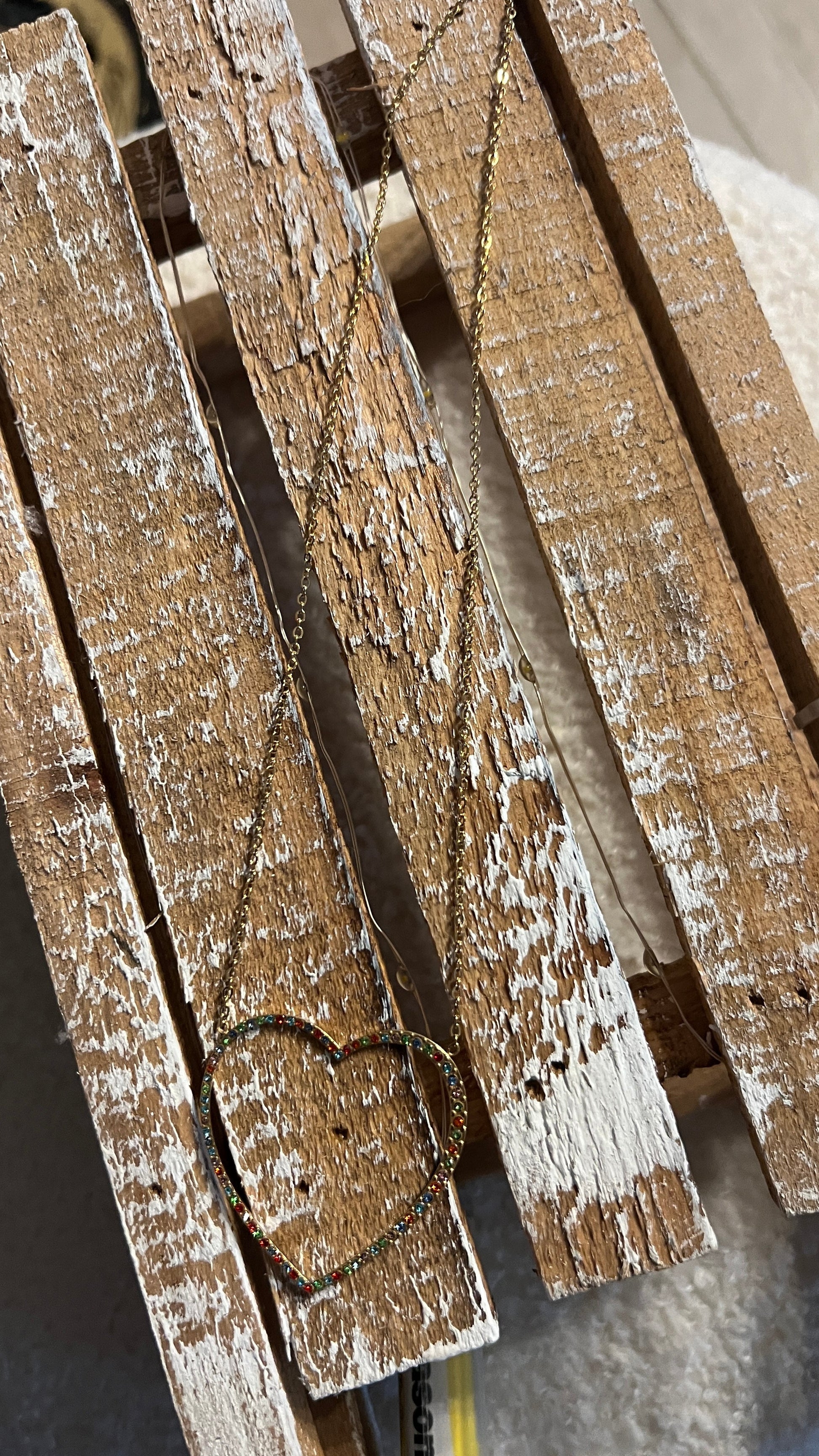 Ce collier doré se distingue par son grand pendentif cœur multicolore brillant, symbole d’amour et de joie. Les pierres multicolores scintillantes captent la lumière à chaque mouvement, apportant éclat et gaieté à votre look.