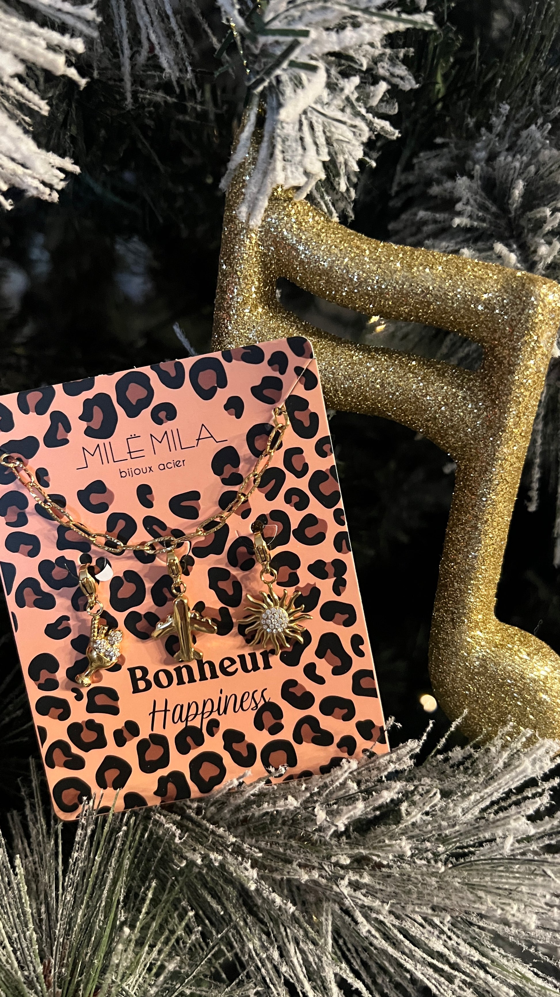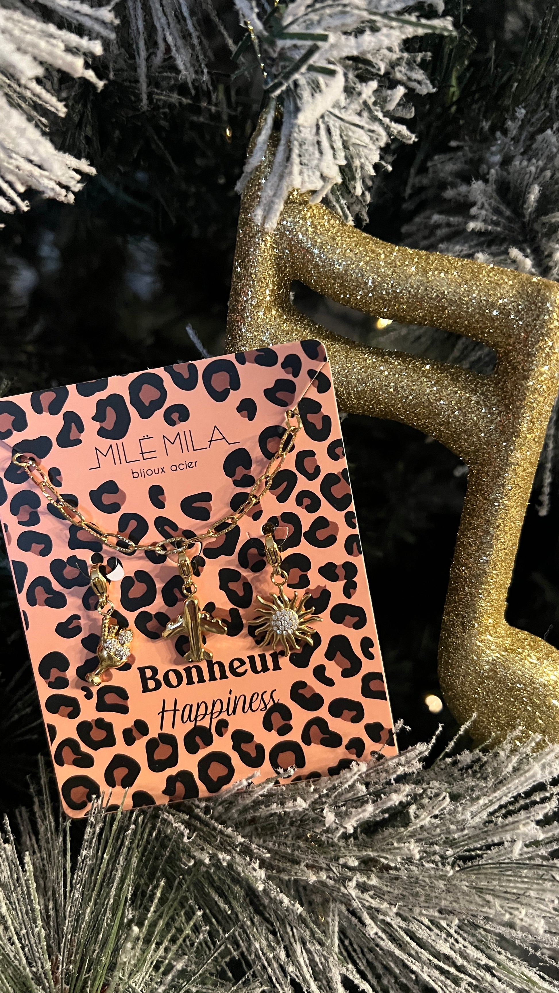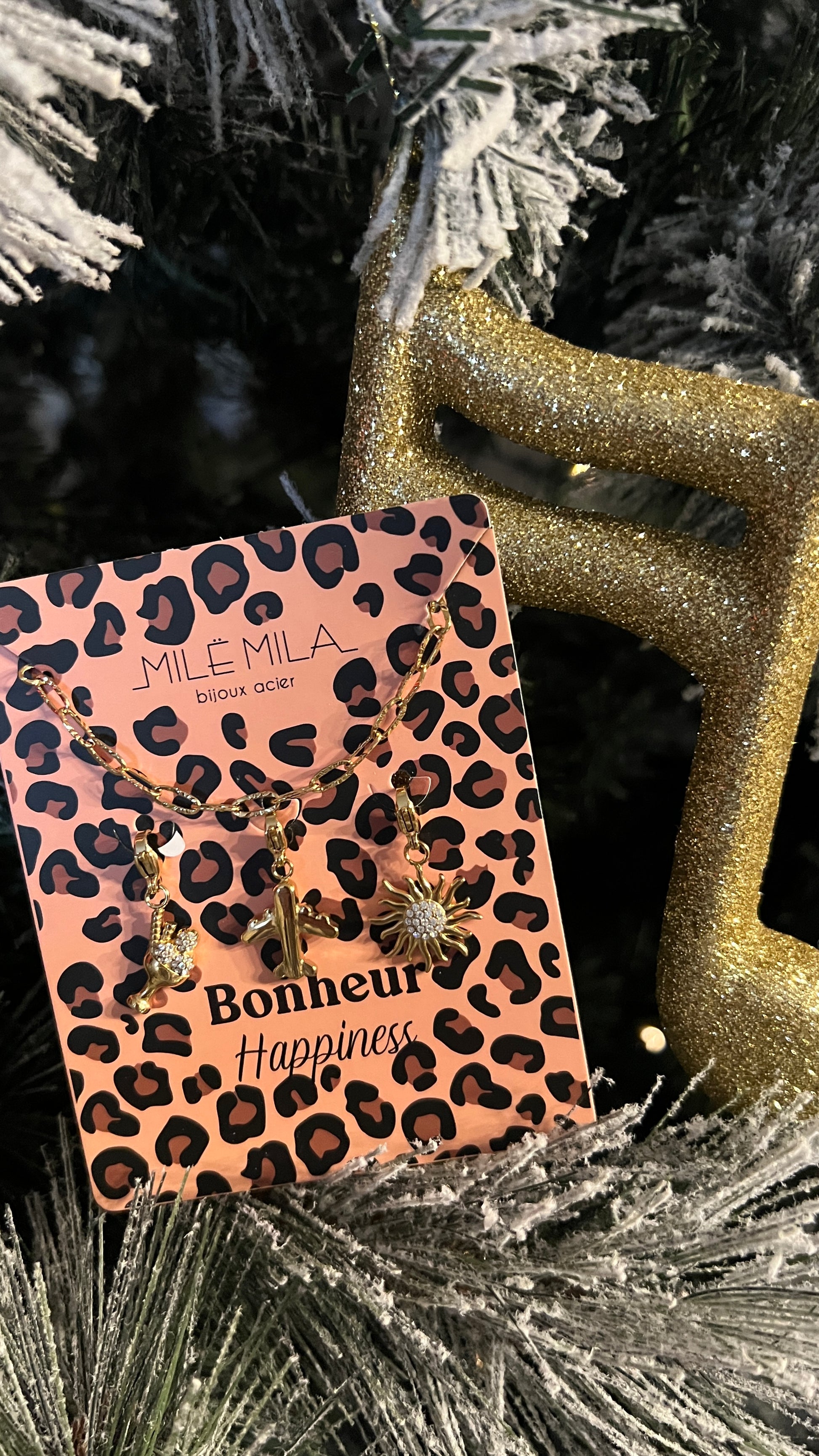 Ce collier doré à maillons en acier inoxydable signé Milé Mila combine élégance, durabilité et symbolique positive. Il est orné de trois charms représentant le thème du bonheur (Happiness) : une coupe de champagne pour célébrer les moments joyeux, un avion pour symboliser la liberté et l’évasion, et un palmier évoquant détente et art de vivre.