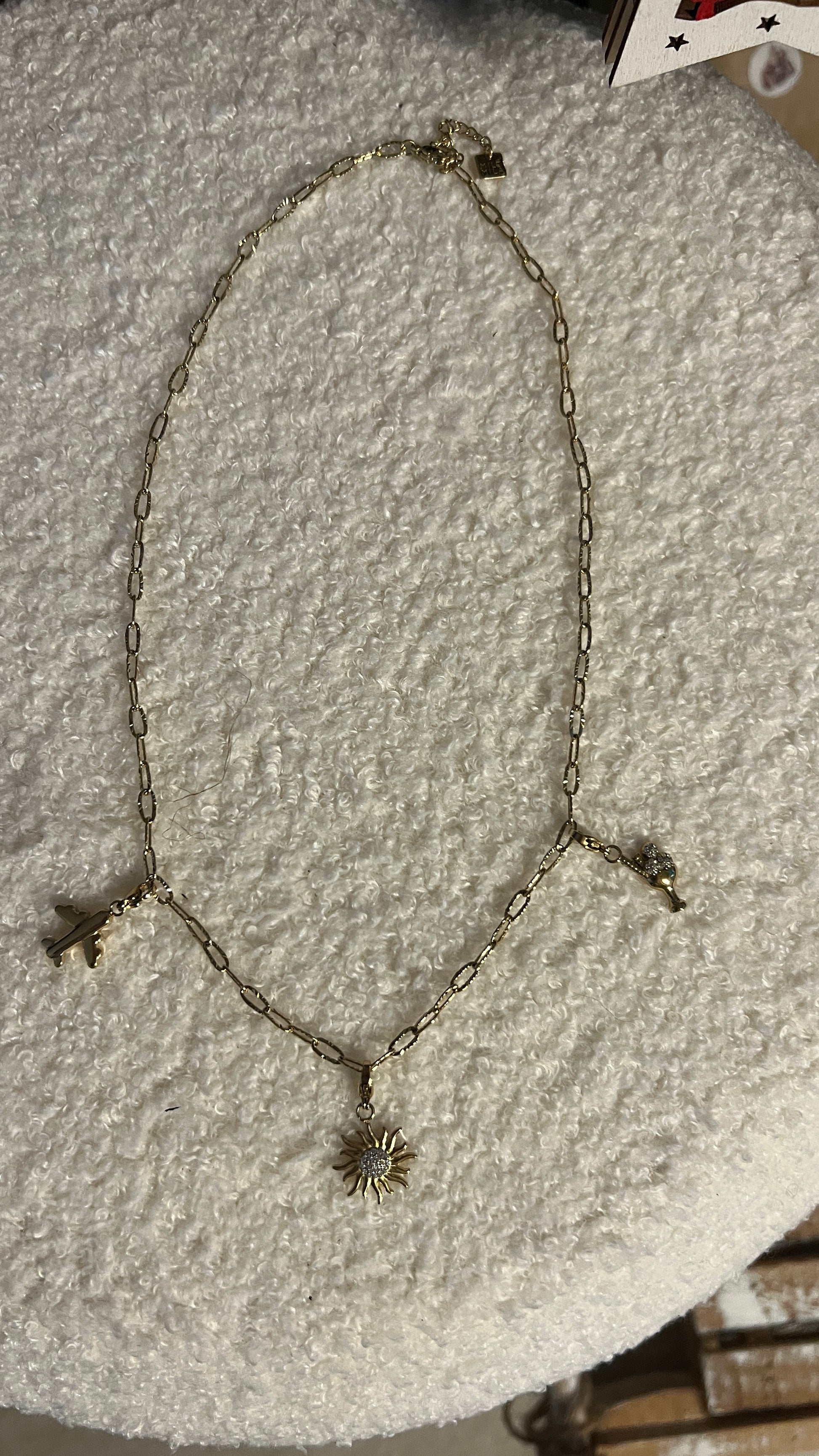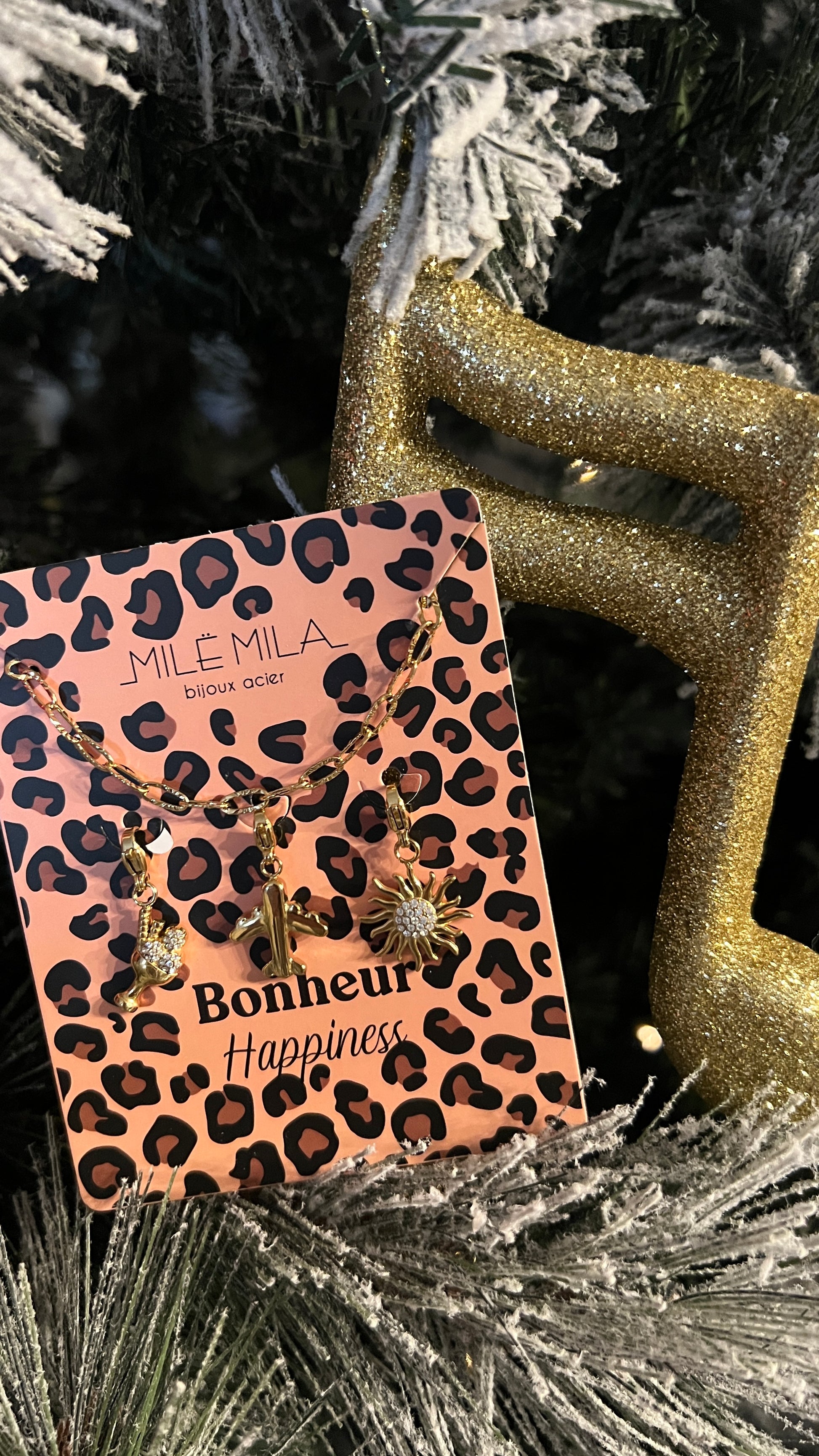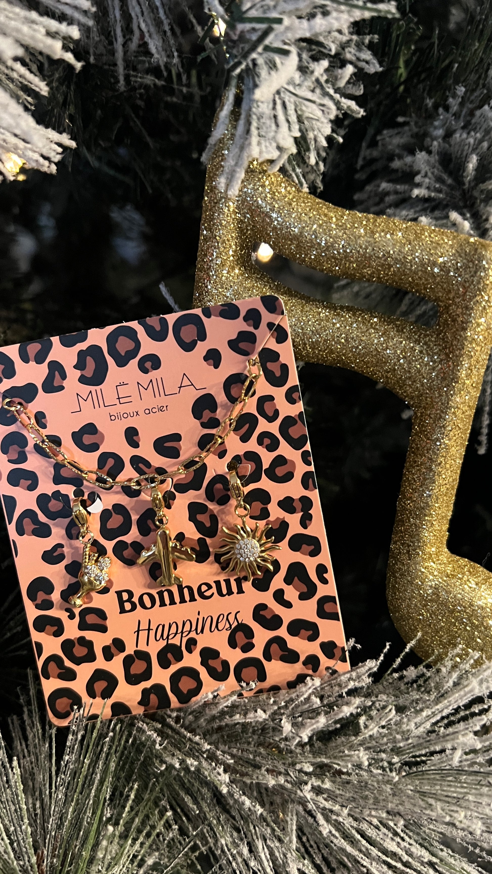 Ce collier doré à maillons en acier inoxydable signé Milé Mila combine élégance, durabilité et symbolique positive. Il est orné de trois charms représentant le thème du bonheur (Happiness) : une coupe de champagne pour célébrer les moments joyeux, un avion pour symboliser la liberté et l’évasion, et un palmier évoquant détente et art de vivre.