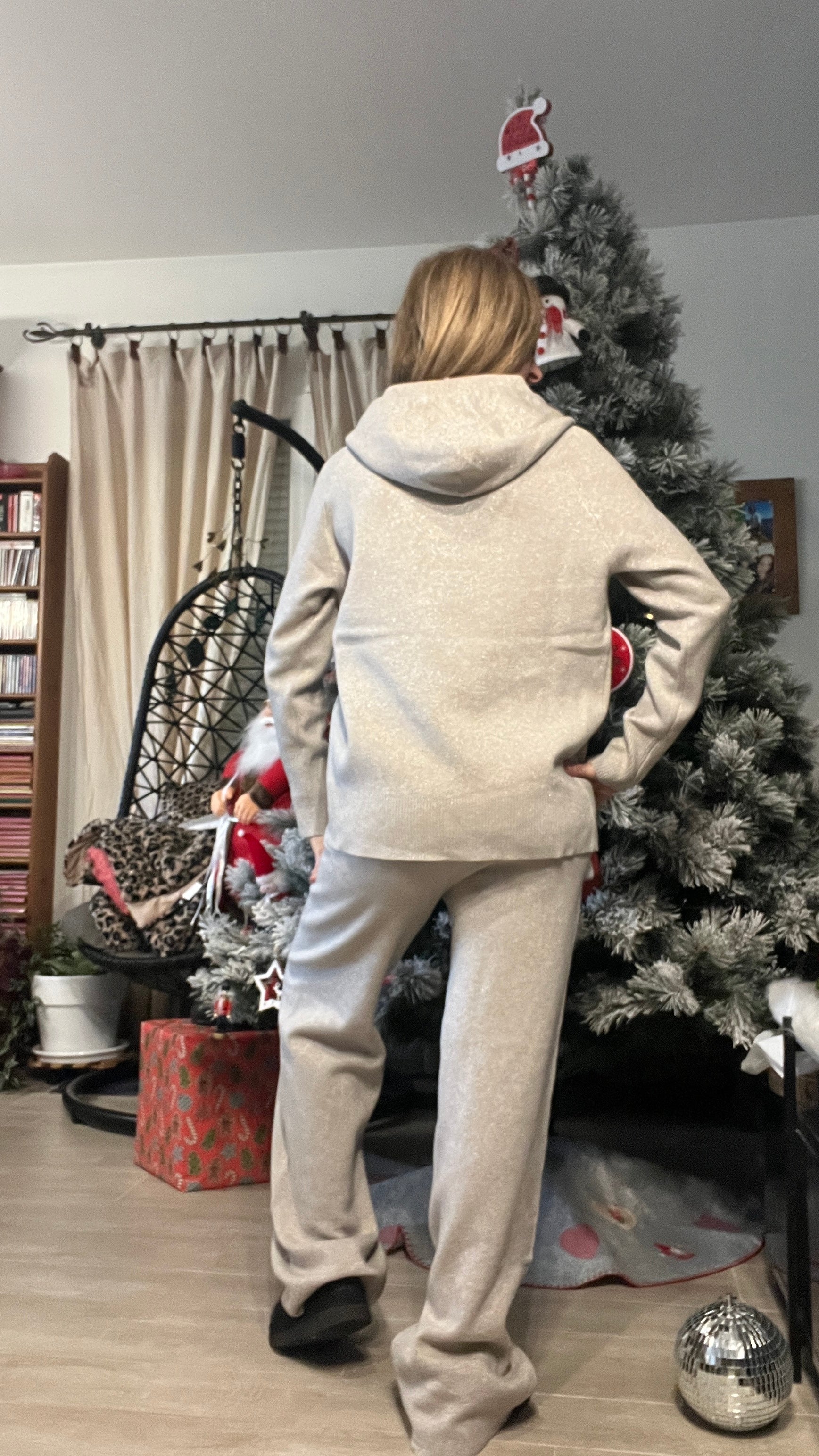 ENSEMBLE PANTALON/PULL A CAPUCHE PAILLETEE BEIGE