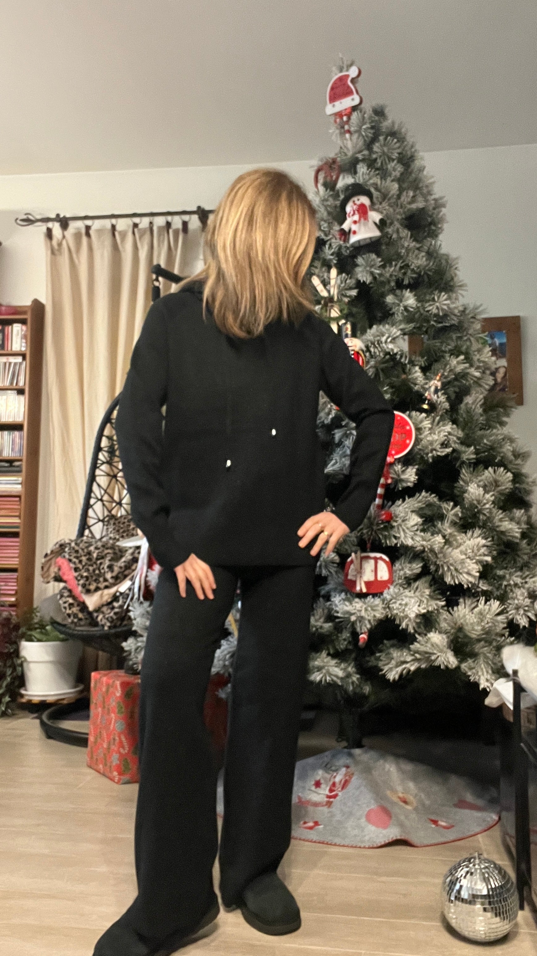 ENSEMBLE PANTALON/PULL A CAPUCHE PAILLETEE NOIR