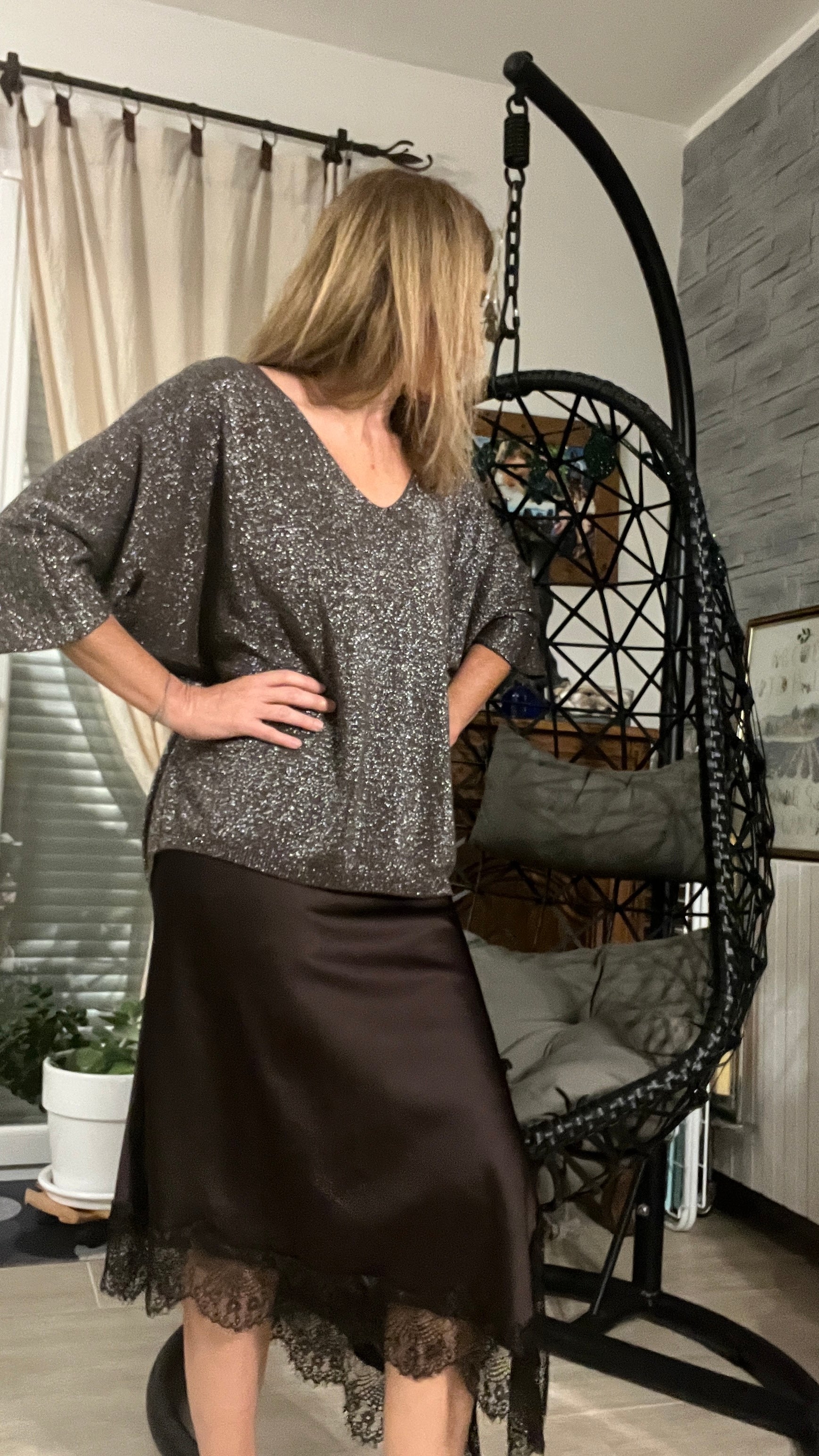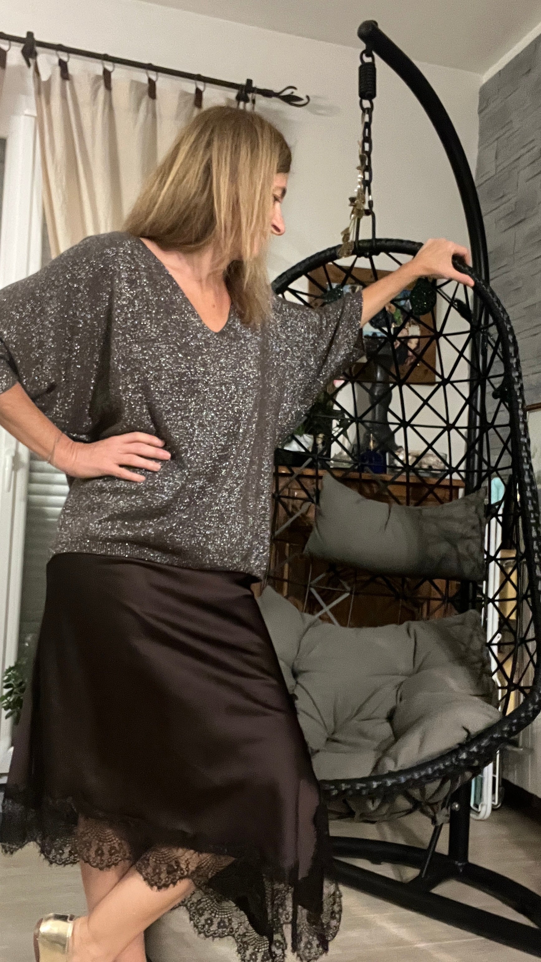 Sublimez votre allure avec cette jupe chocolat longue en dentelle asymétrique, une pièce élégante et pleine de caractère signée Clothes by M&C.