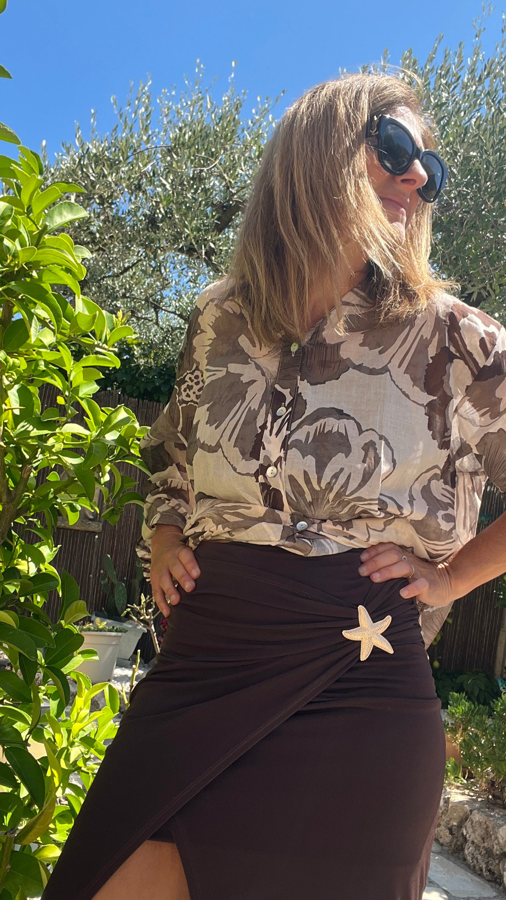 La broche étoile de mer dorée, positionnée à l’avant, ajoute un détail précieux et original qui transforme cette jupe en véritable pièce maîtresse de votre tenue. Amovible, elle vous permet de personnaliser votre style selon vos envies.