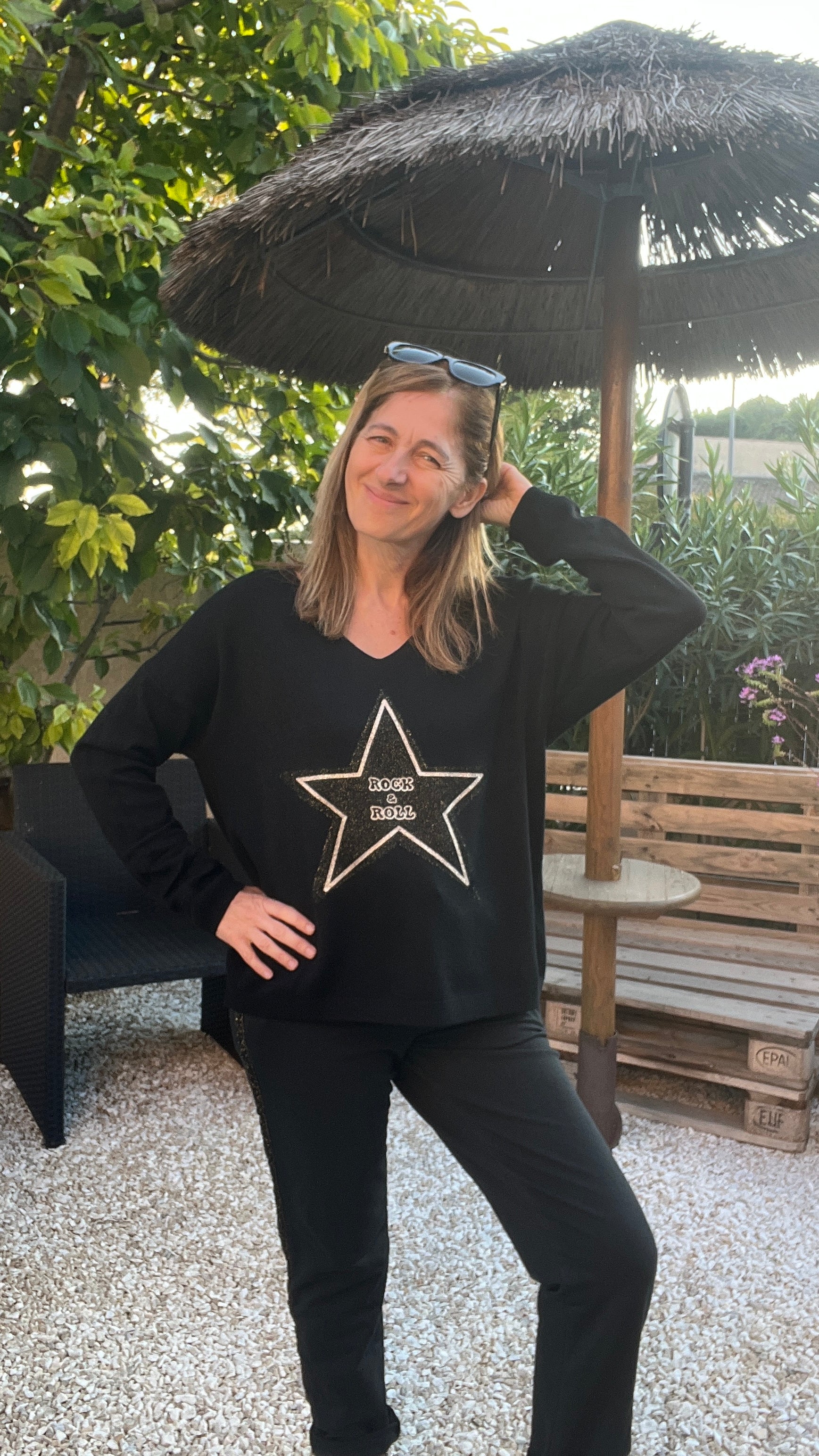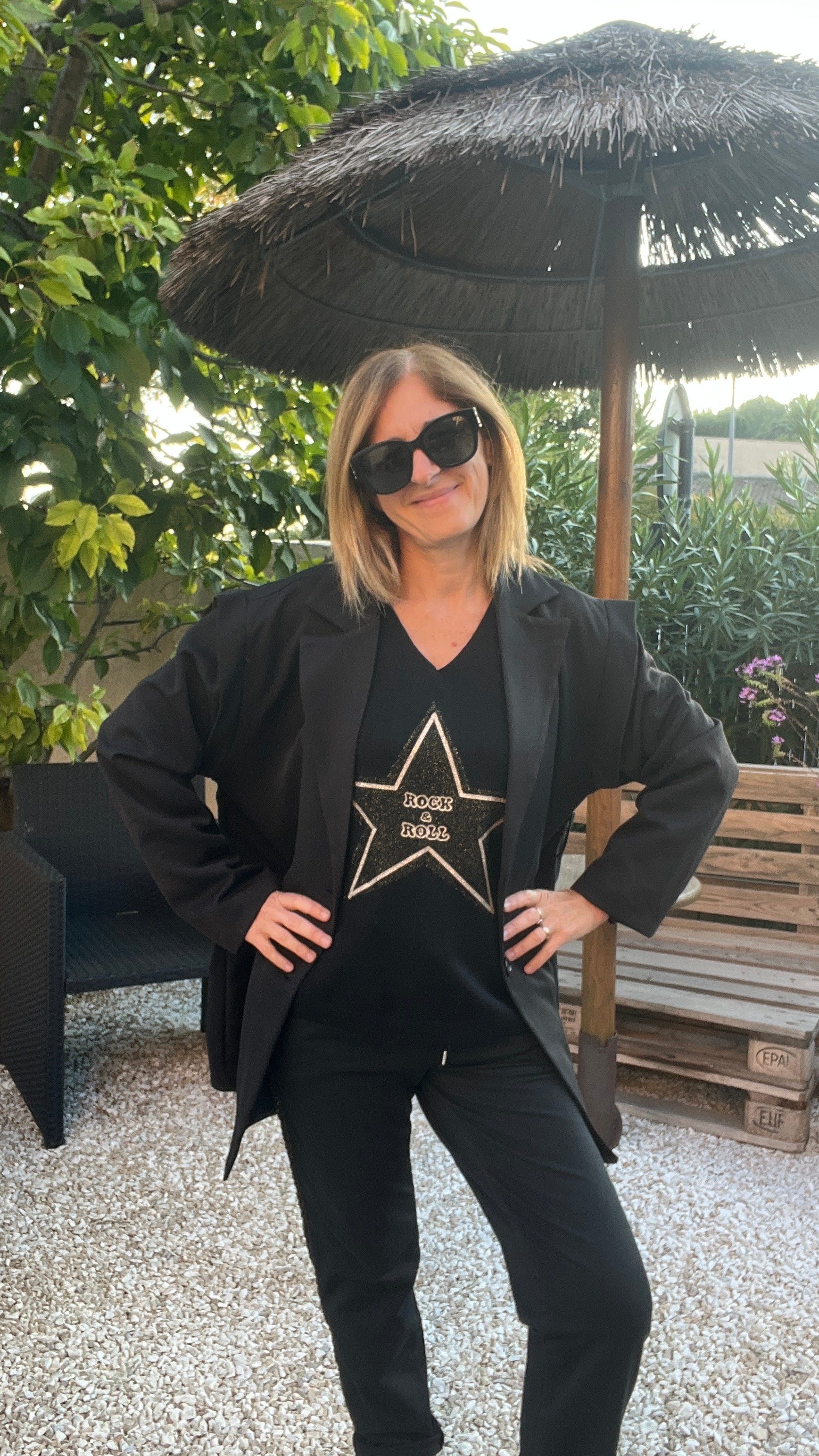 Le col en V apporte une touche de féminité et d’élégance, tandis que l’étoile dorée et l’inscription “Rock and Roll’s” sur le devant ajoutent un esprit rock et moderne à votre tenue.