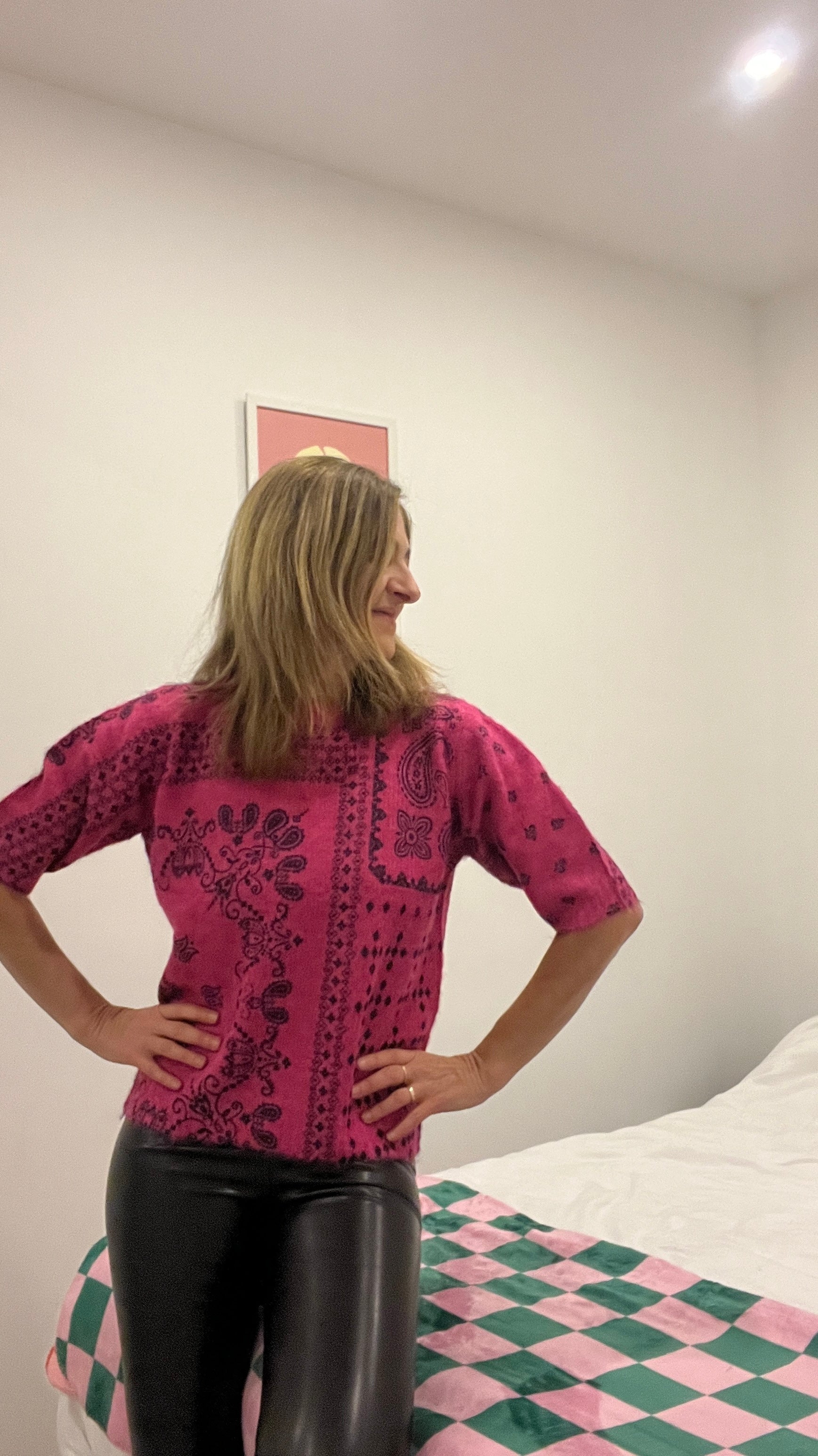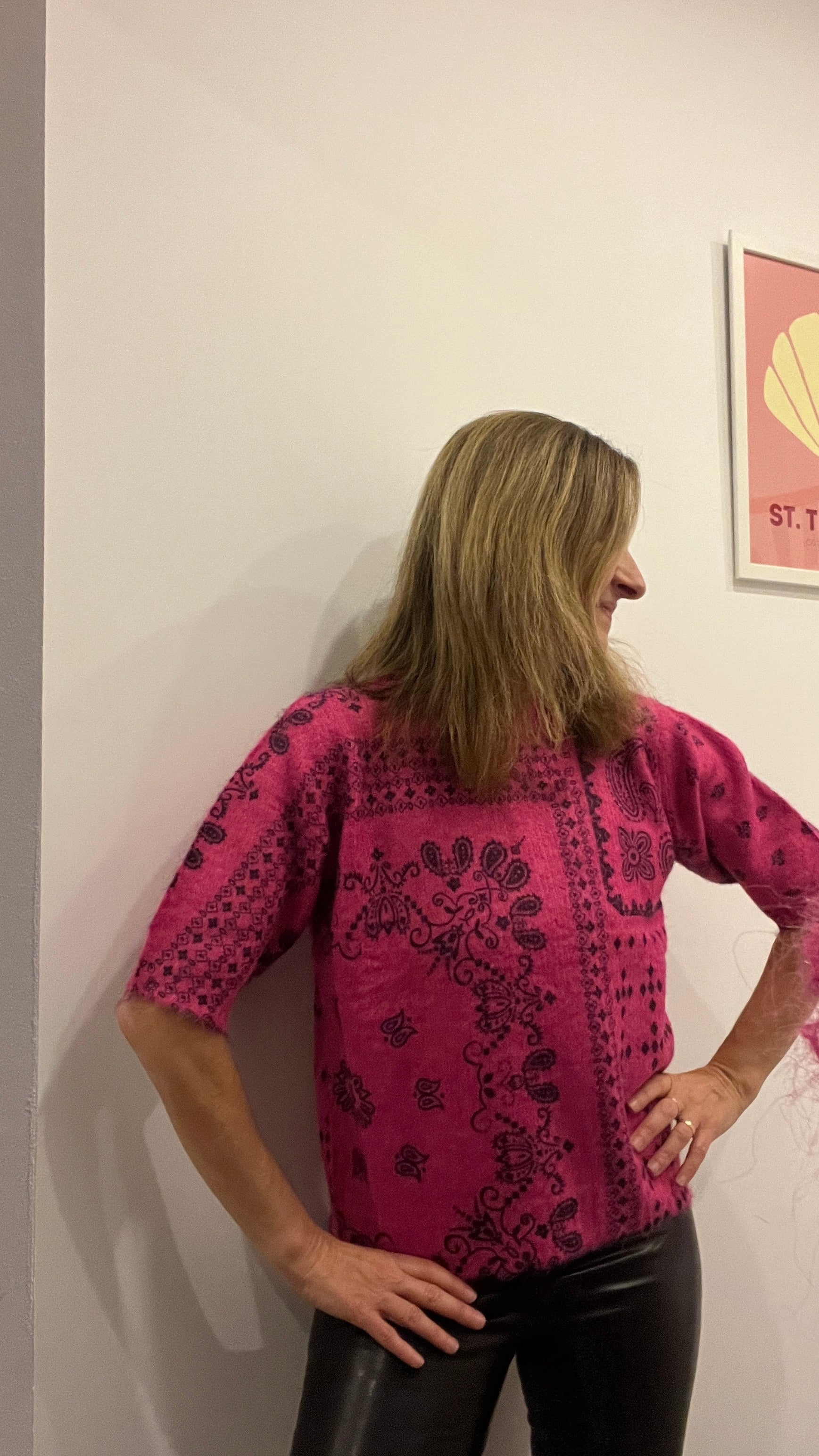 Adoptez un style vibrant avec ce pull rose fuchsia sublimé par un motif bandana noir au design tendance et original. Sa couleur intense apporte instantanément de la luminosité à votre look, tandis que sa coupe à manches courtes le rend parfait pour la mi-saison ou pour dynamiser une tenue plus simple.