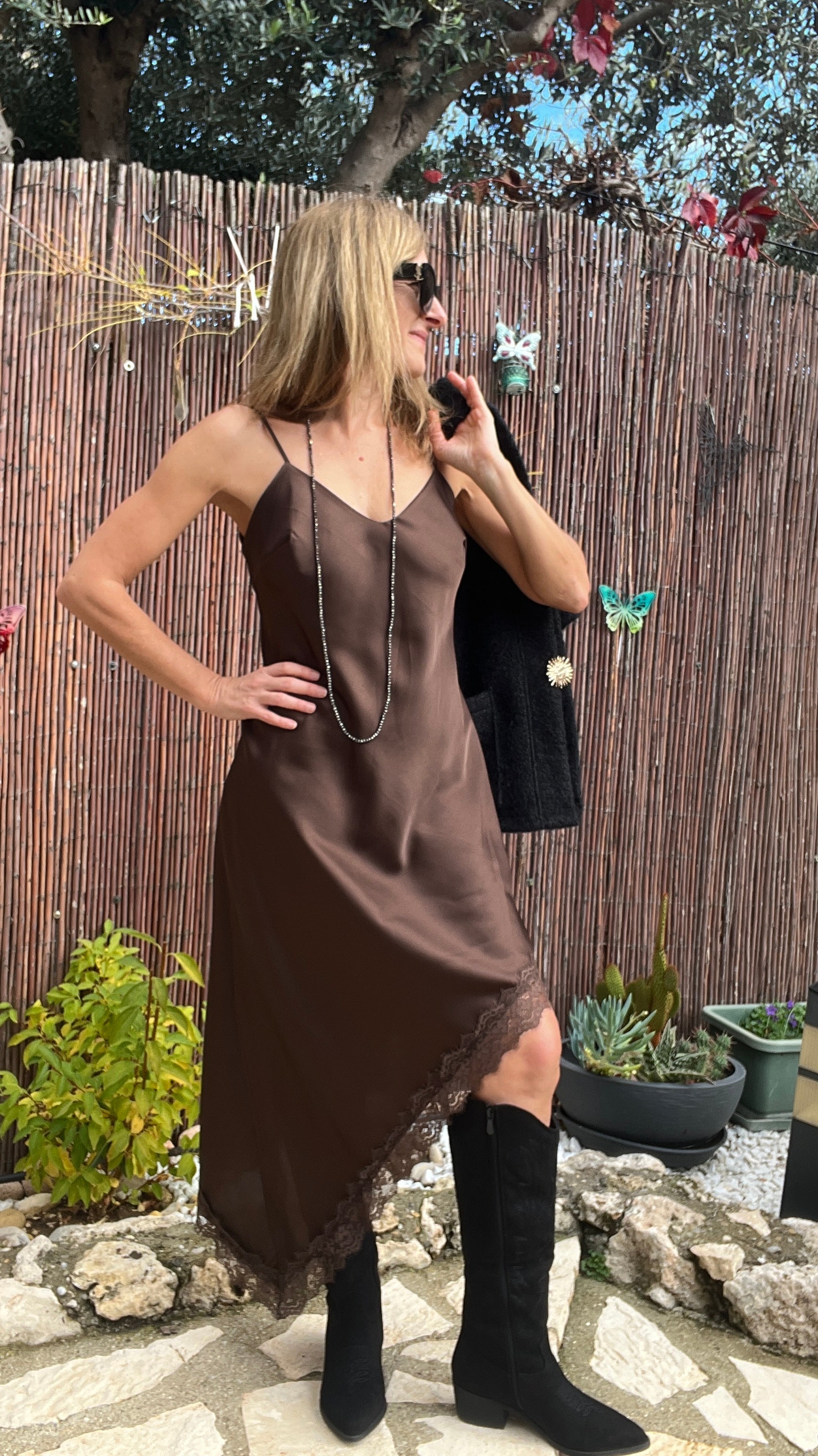 ROBE BRETELLES CHOCOLAT ASYMETRIQUE DENTELLE