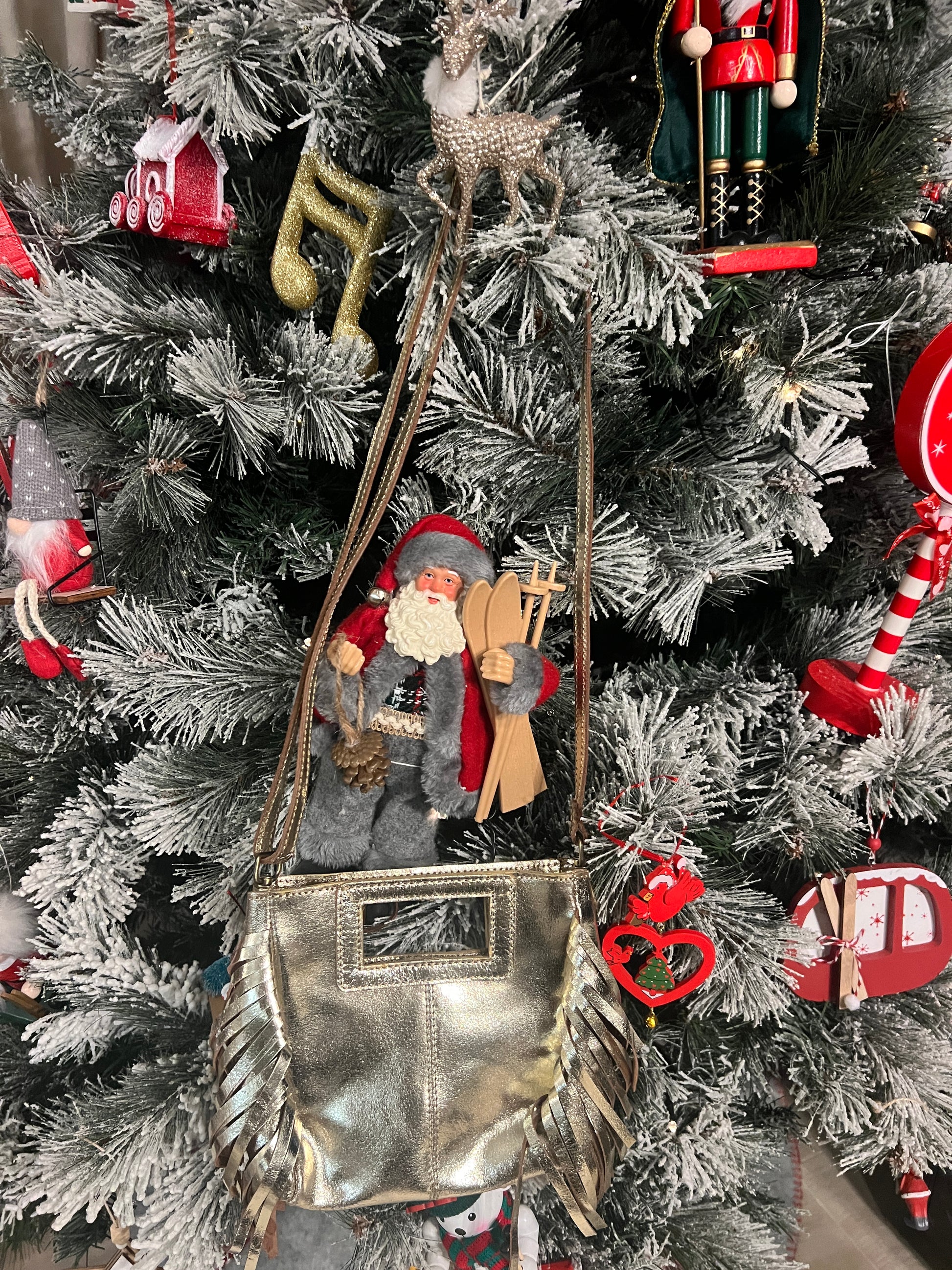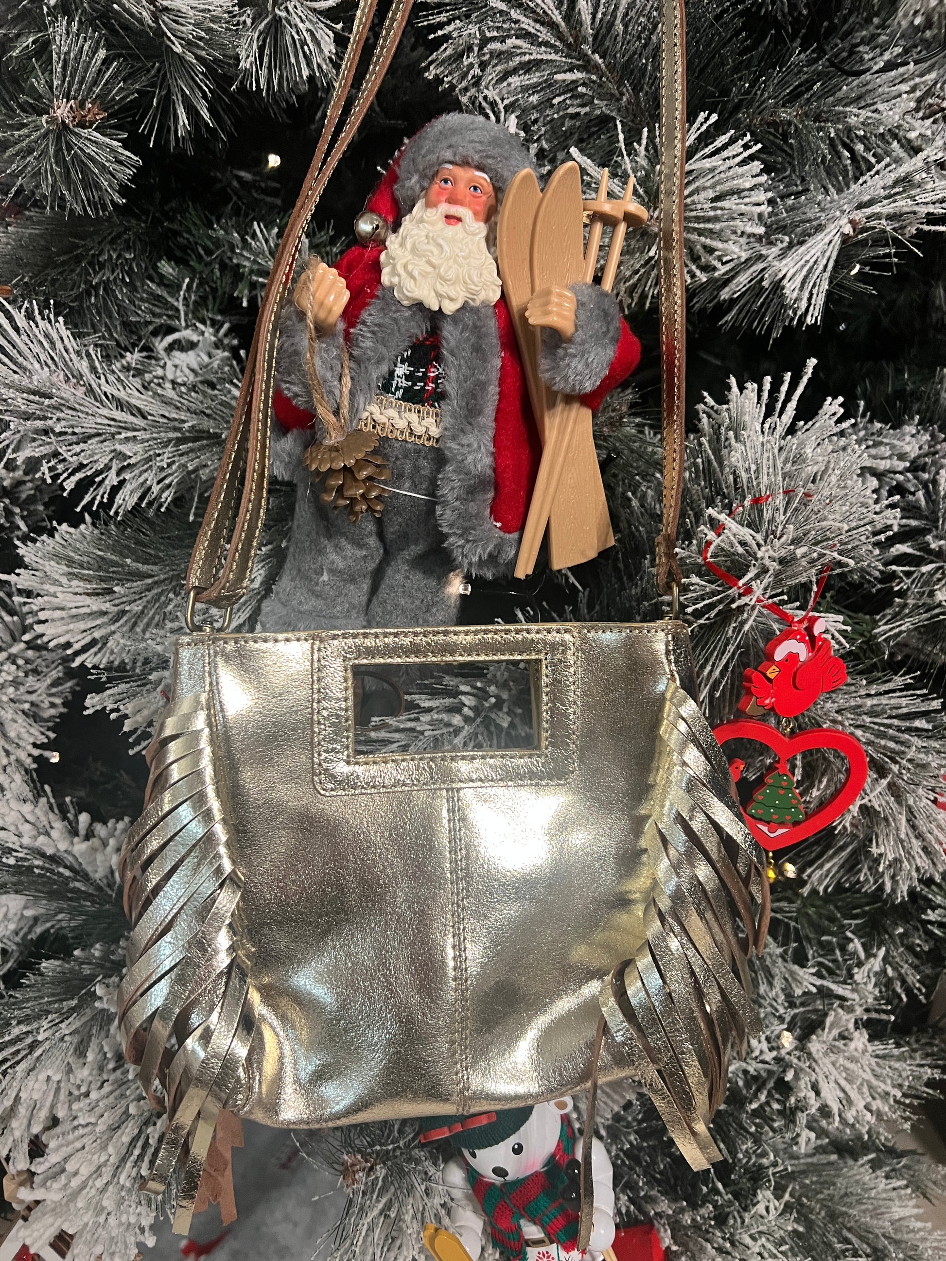 Idéal pour compléter une tenue chic, ce sac en cuir doré à franges est une pièce tendance et raffinée, parfaite pour les fêtes de fin d’année et les occasions spéciales.