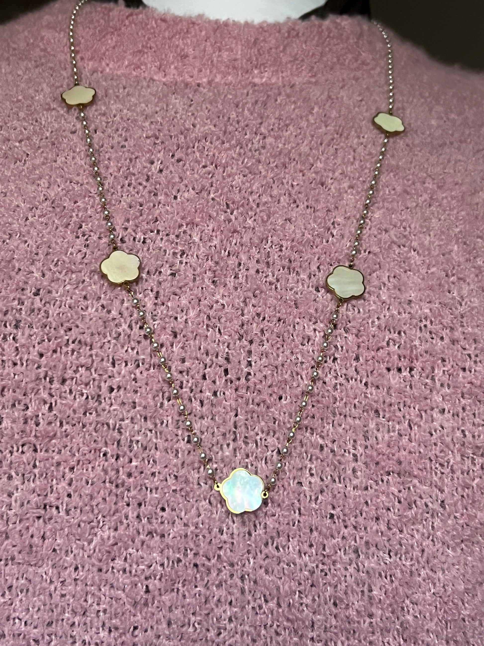 Ce sautoir se compose de perles imitation culture fines et délicates, alternées de petites fleurs blanches subtilement placées pour un effet romantique et lumineux. Chaque détail apporte une touche féminine et élégante, parfaite pour sublimer toutes vos tenues, du quotidien aux occasions spéciales.