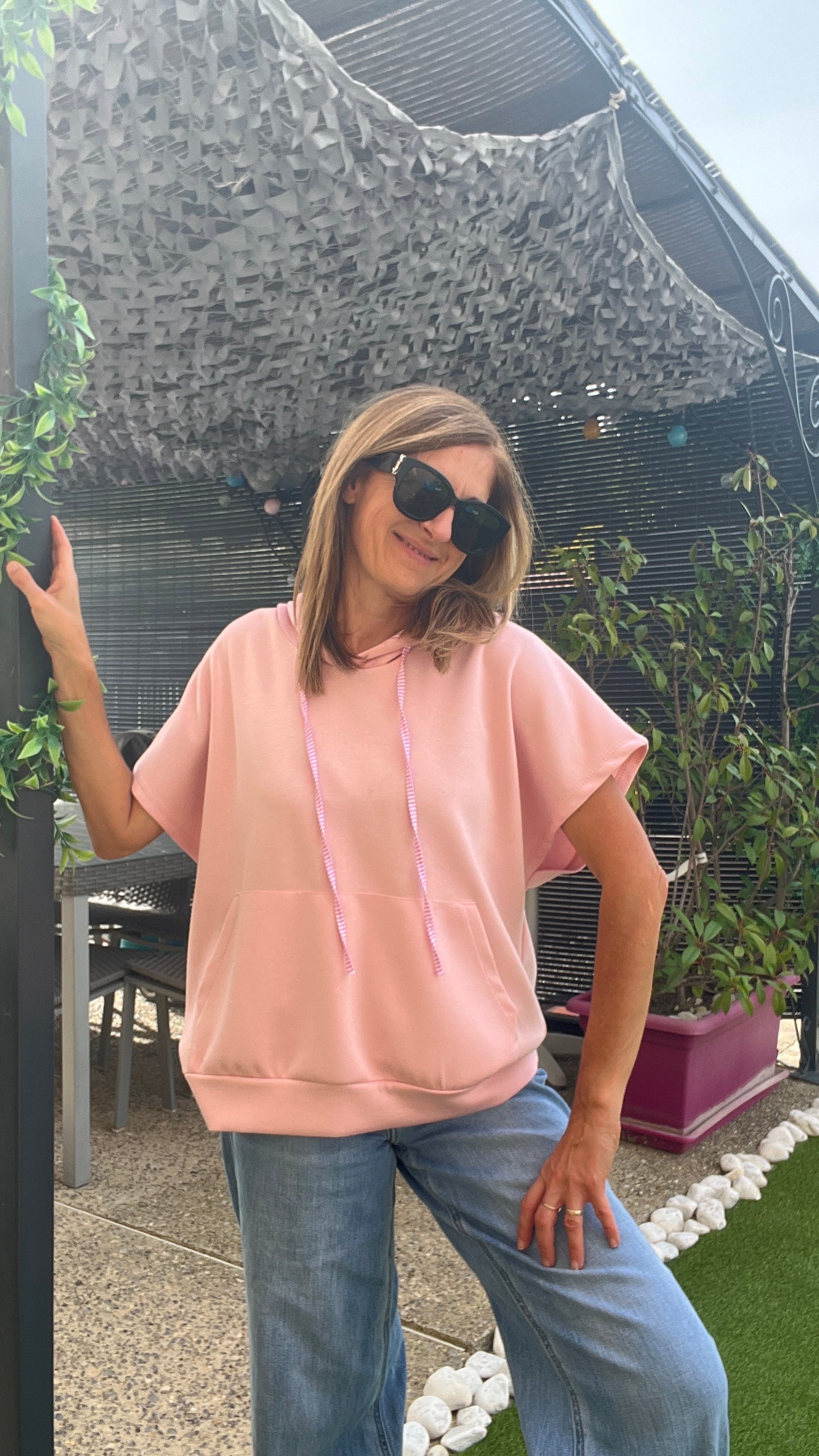 SWEAT A CAPUCHE ROSE MANCHES COURTES "CAPUCINE"