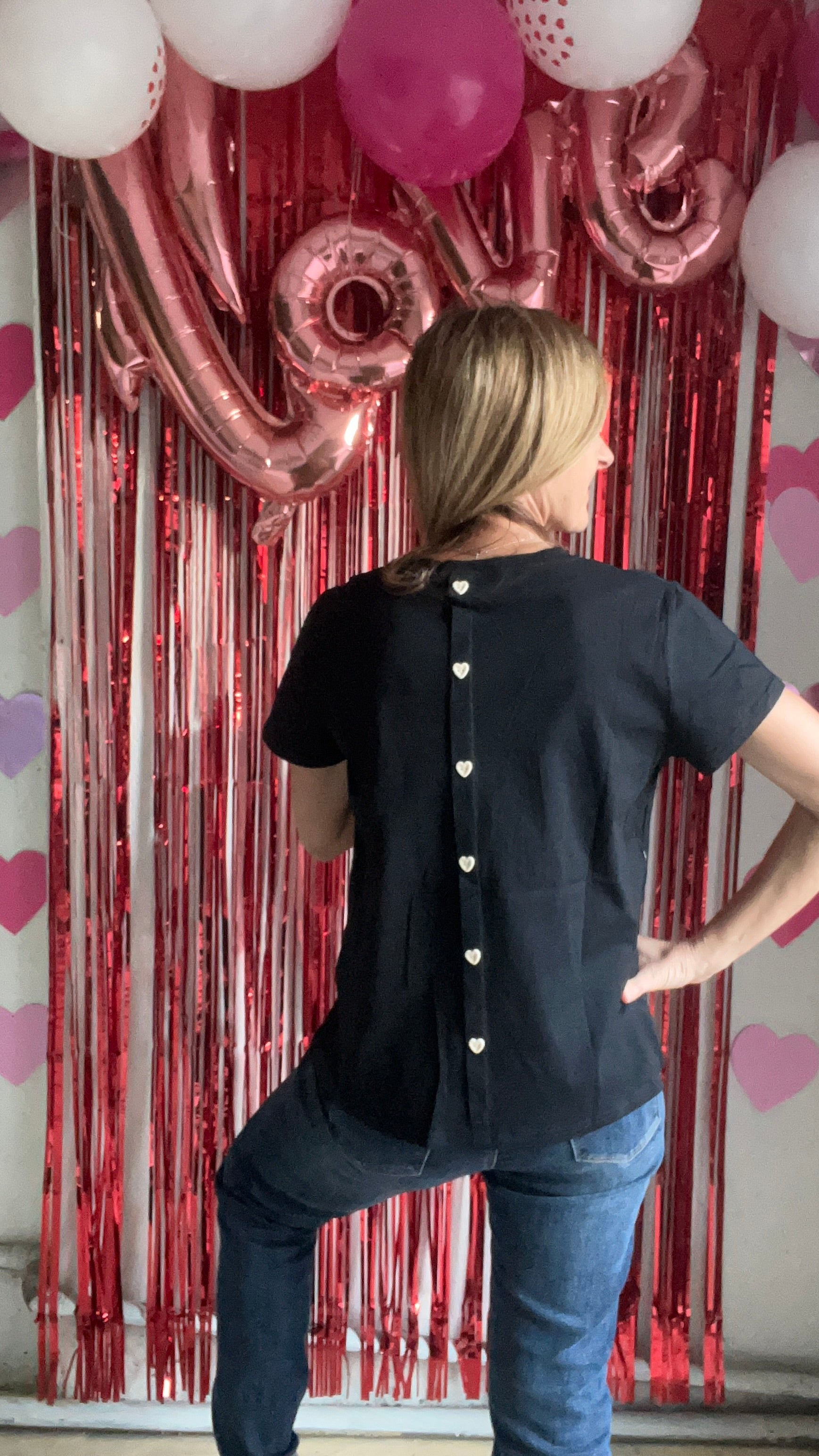 Le tee-shirt blanc ou noir à cœurs brodés et boutons cœur au dos est une pièce tendre et élégante, parfaite pour celles qui aiment les détails subtils et le style romantique.