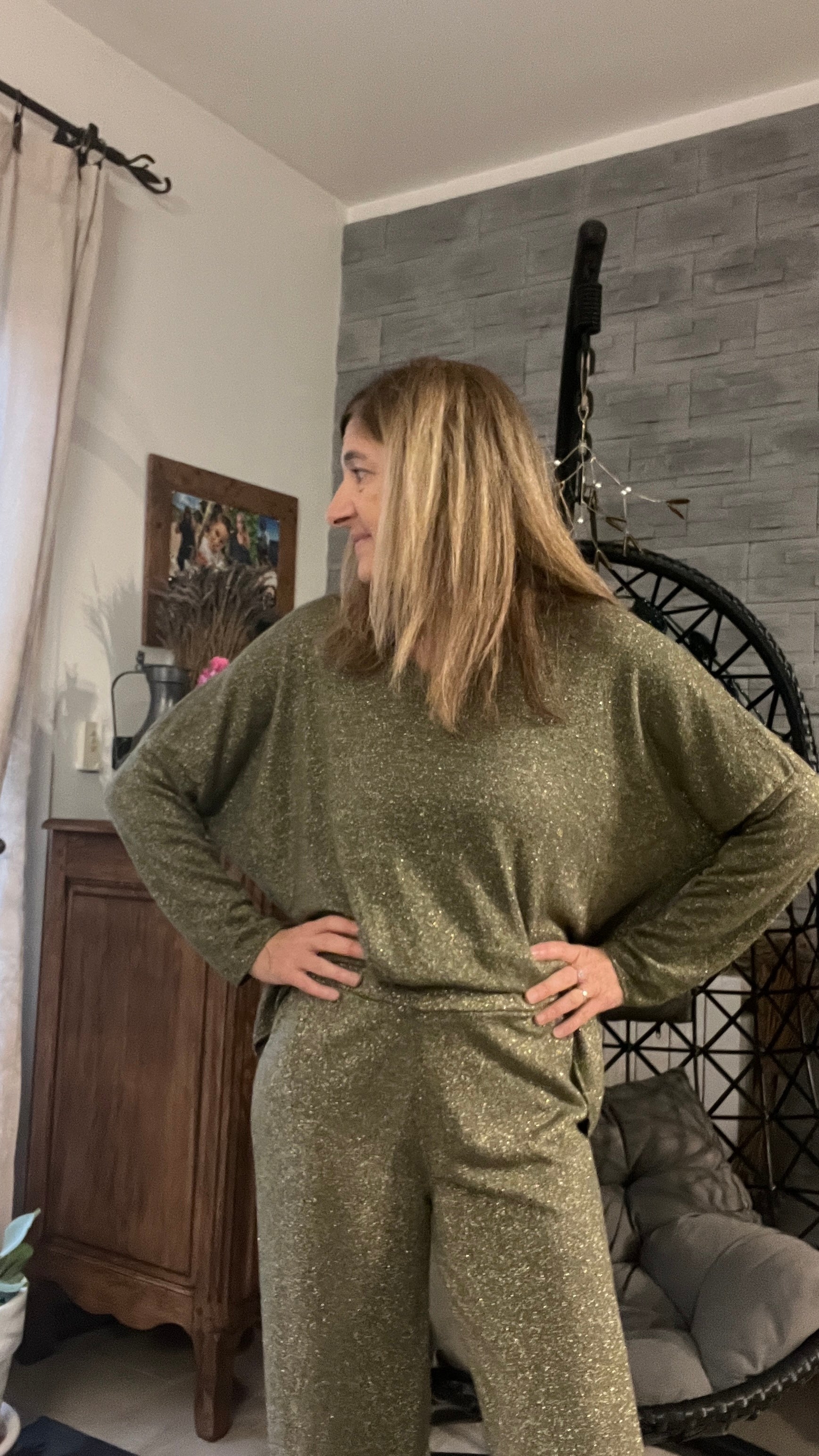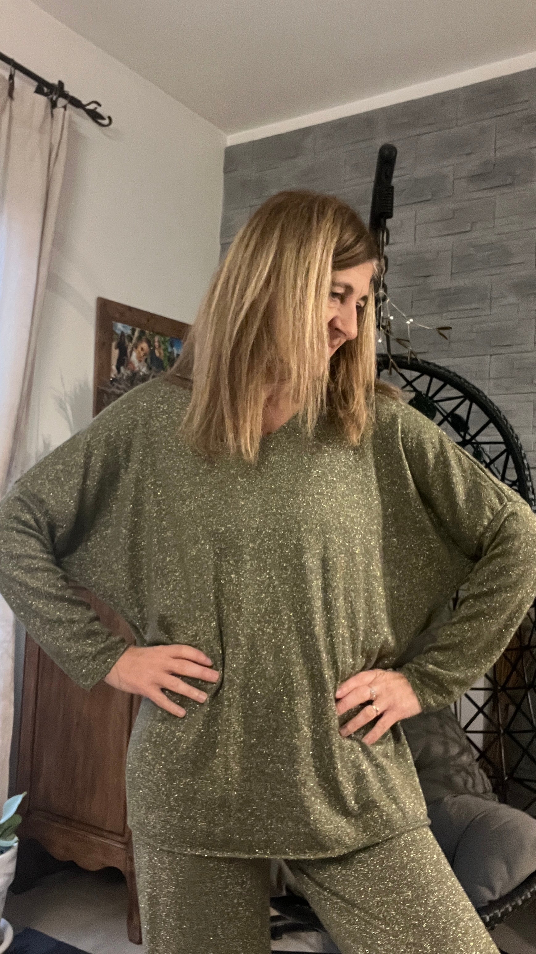 Découvrez le tunique kaki à paillettes manches longues, col en V, coloris noir doré par Clothes by M&C, une pièce élégante et scintillante qui apporte style et confort au quotidien.