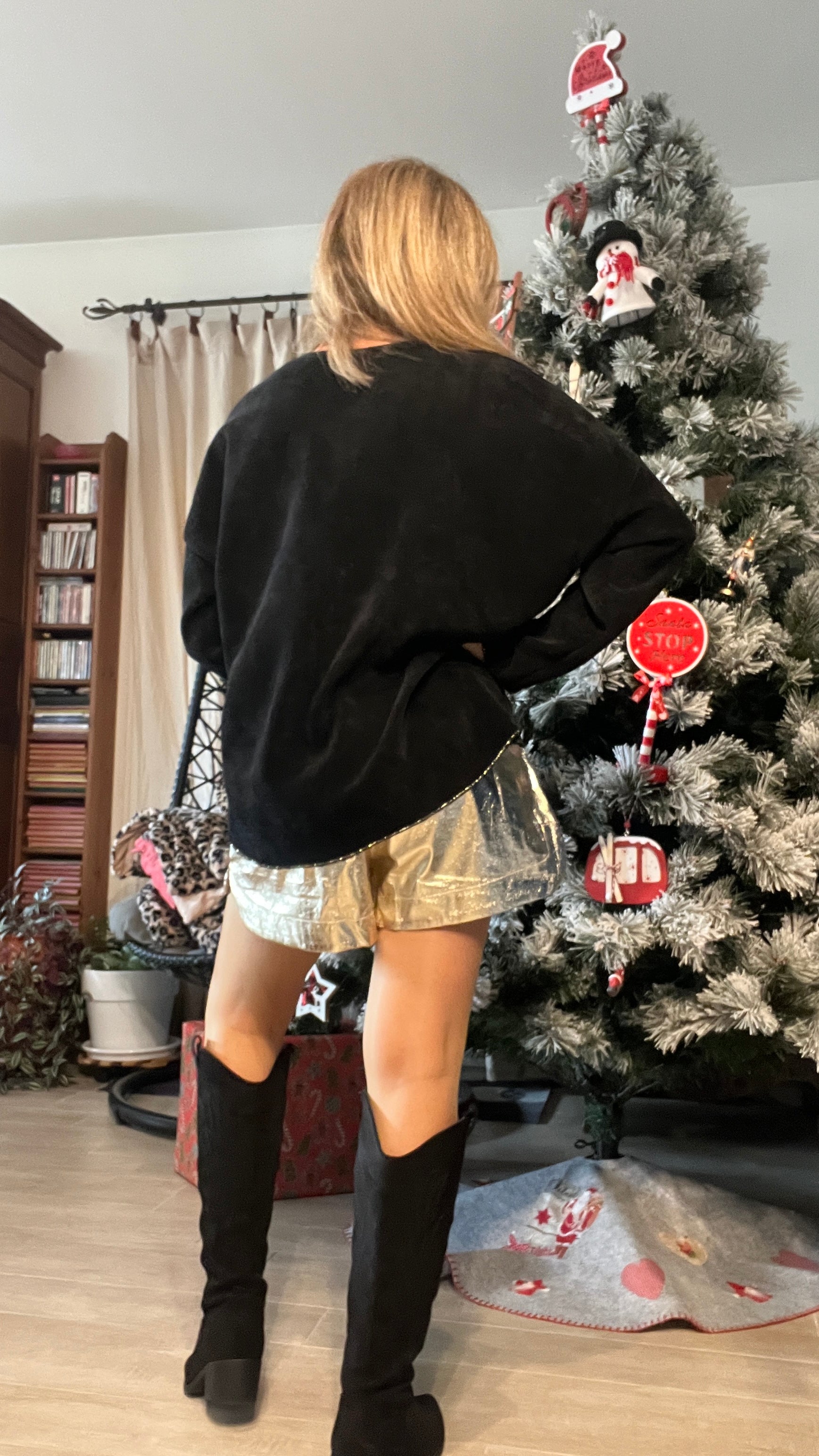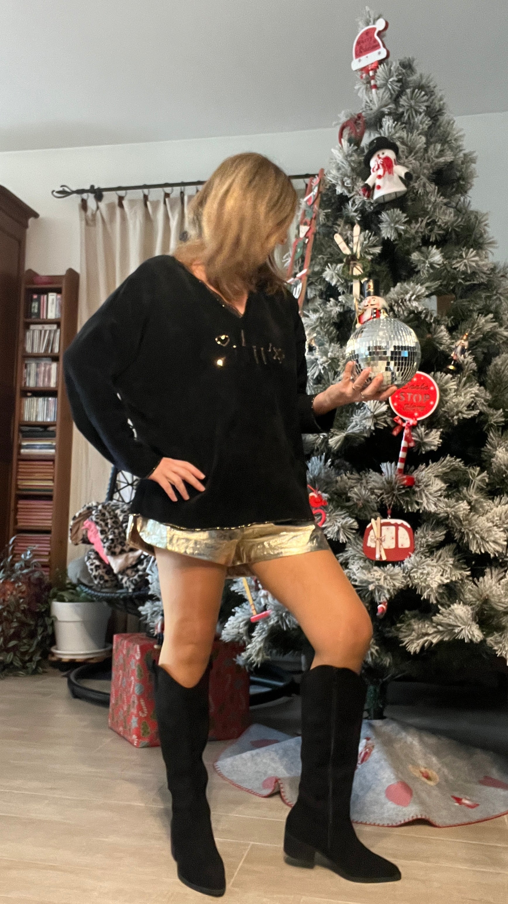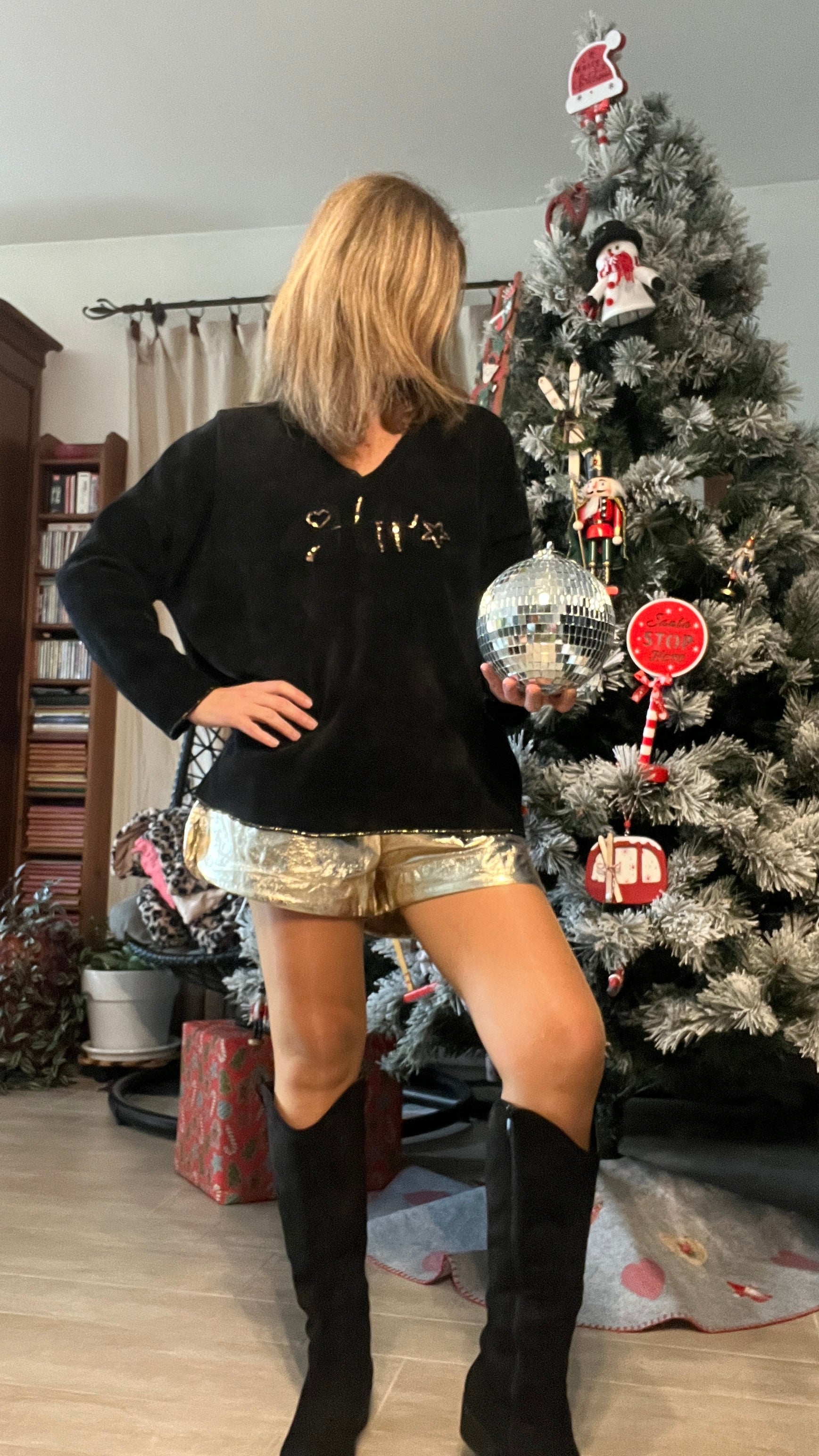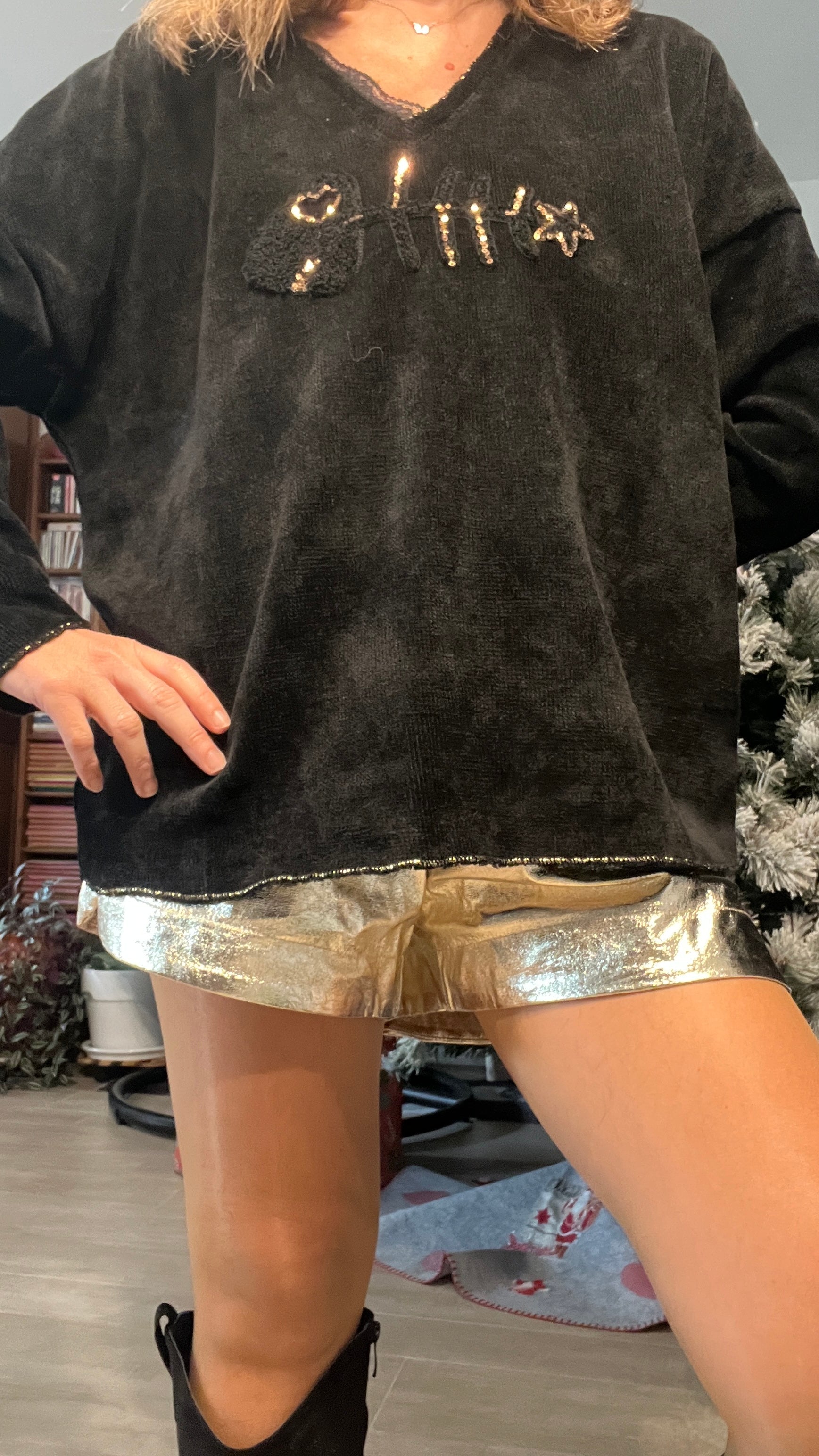 Laisse-toi séduire par ce superbe pull tunique noir en velours, à la fois doux, brillant et incroyablement agréable à porter. Sa coupe ample et moderne met la silhouette en valeur tout en offrant un confort parfait. L’inscription “un poisson doré avec une étoile dorée & un cœur. il ajoute une touche glamour et lumineuse, idéale pour illuminer n’importe quelle tenue. Porté avec un jean, un legging ou une jupe, ce pull tunique devient la pièce incontournable pour un style cosy, tendance et résolument féminin.