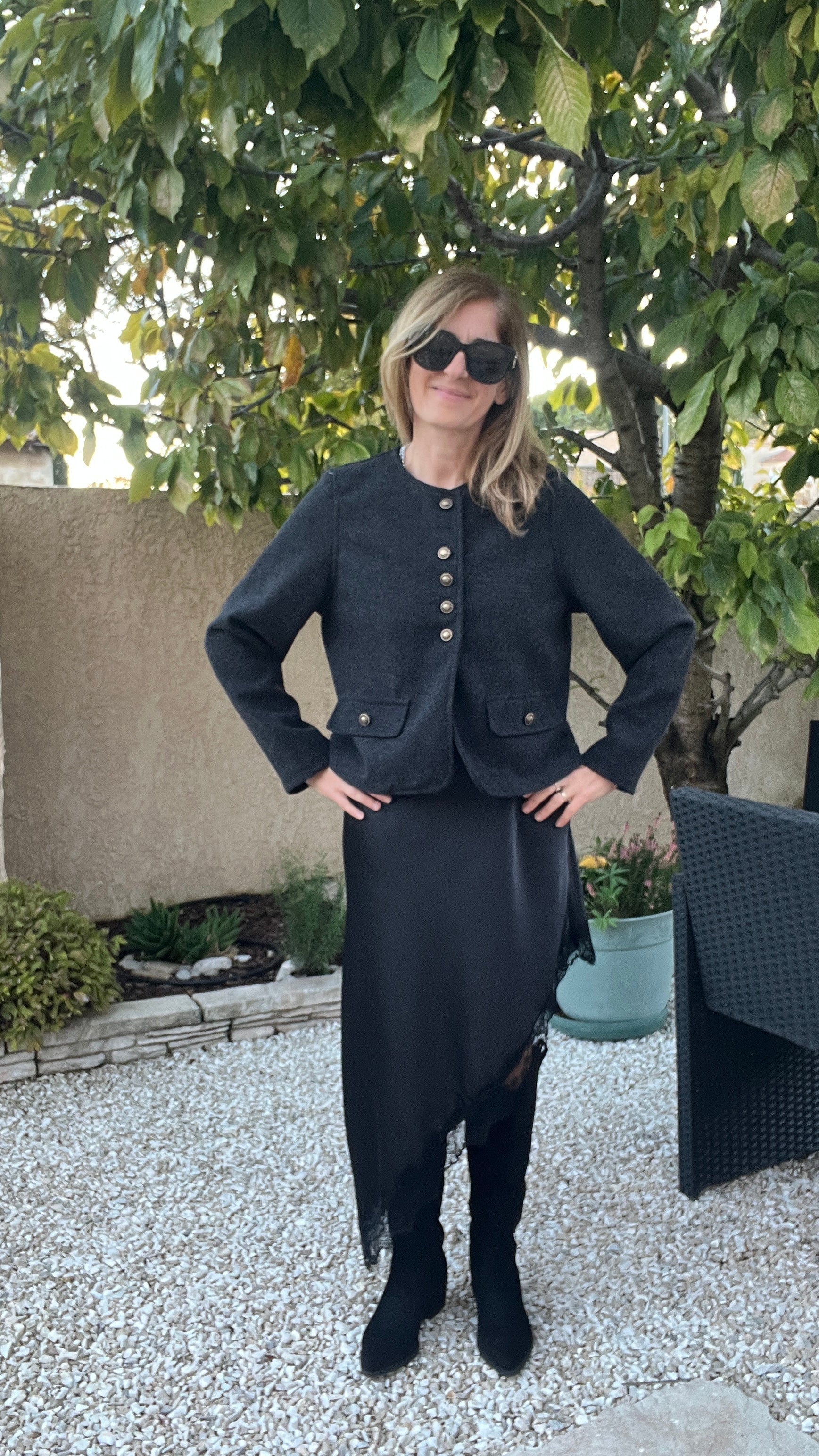 Idéale pour porter sur une robe, un pantalon habillé ou un jean, cette veste grise à boutons doré-cuivre est une pièce polyvalente et chic, parfaite pour le bureau, un dîner ou une sortie élégante. Idéale pour la saison Automne/hiver.